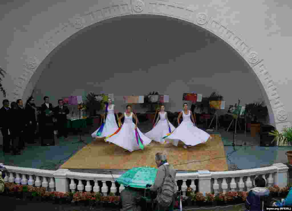 В субботу 24 октября в Никитском ботаническом саду (НБС) торжественно открылся традиционный, 62-й, «Бал хризантем». В отличие от прежних лет, в нынешнее мероприятие его организаторы добавили «политические» детали. Летняя сцена была увешена партийными флагами «Единой России», и все без исключения выступающие из Совета министров Крыма и администрации Ялты в cтиле советского прошлого благодарили руководство, в частности российского президента Владимира Путина и крымского главу Сергея Аксенова, за помощь в сохранении и развитии учреждения.