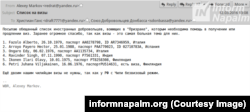 – Cепаратисты очень часто в переписках указывают списки личного состава, свои фамилии, клички и позывные. В одном из таких писем был список иностранцев, которым требуется помощь в получении или продлении виз. Этот список шлет заместитель командира батальона "Призрак" в Союз добровольцев Донбасса и пользователю с ником "draft7771" – это Ольга Кулыгина, довольно известный персонаж на Донбассе. Она была задержана в самые первые месяцы начала "Русской весны", а потом очень удачно обменена. Наверное, человек, которому шлют письмо с вопросом по продлению и получению виз, имеет какое-то отношение к российским органам. И, собственно говоря, этот же email пришел в "Союз добровольцев Донбасса".