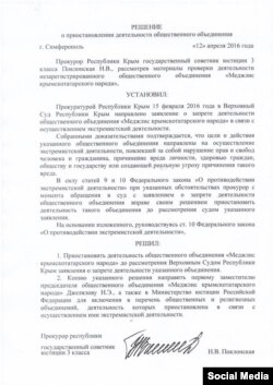 «Сегодня мной было принято решение о приостановлении деятельности общественного объединения «Меджлис крымскотатарского народа» в целях недопущения нарушения федерального законодательства. Меджлису запрещается пользоваться всеми государственными и муниципальными СМИ, проводить различные публичные массовые мероприятия, использовать банковские вклады и вообще проводить какую-либо работу. Вся их пропаганда будет запрещена», – отметила она.