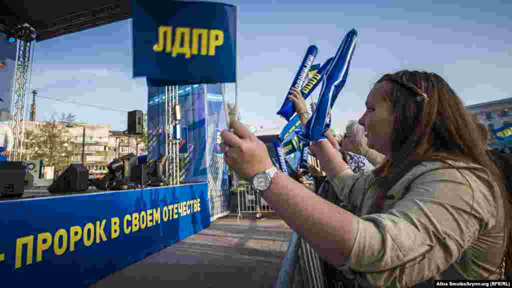 На площади Ленина 3 мая в Симферополе российская партия ЛДПР организовала агитационный концерт, в котором приняли участие исполнители Алексей Гоман и Катя Лель. Как сообщает корреспондент Крым.Реалии, у сцены принимали обращения граждан к партии и ее главе Владимиру Жириновскому. Крымчанам также привезли макет политика, с которым мог сфотографироваться каждый желающий.