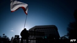 Утром спикер крымского парламента Владимир Константинов вернулся из Москвы. Внеочередную сессию Верховной Рады Крыма назначили на 12:00. Журналистов внутрь не пропускали.