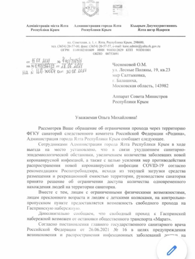Ольга Чеснокова пишет в соцсетях, что имеет жилье в Гаспре, поэтому регулярно отдыхает там. Письмо от Сергея Стрельбицкого она обнародовала в помощь тем, кто будет пытаться пройти к пляжу через парк «Родины». Активистка призывает местных жителей продолжать борьбу за свободный путь к морю.
