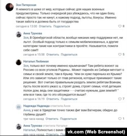 «Вот почему именно крымчанам? Там ребята воюют за Россию со всех уголков Родины. Может, паренёк из Сибири мечтает о семье и своей земле, там, в Крыму. Чем он хуже паренька из Крыма?» – пишет Наталья Любимая (Суходеева).