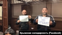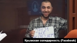 «Эмиль Зиядинов, Тимур Ялкабов, Ленур Сейдаметов, Осман Арифмеметов, Энвер Аметов, Руслан Сулейманов, Рустем Шейхалиев и Яшар Муединов подготовили на своих слушаниях в Южном окружном военном суде и подняли плакаты со словами солидарности в отношении защитника Эдема Семедляева, арестованного в Крыму на 12 суток. В некоторых случаях судебные приставы препятствовали съемке, угрожая представителю СМИ административным протоколом», – говорится в сообщении.