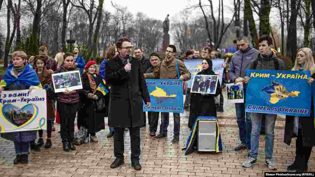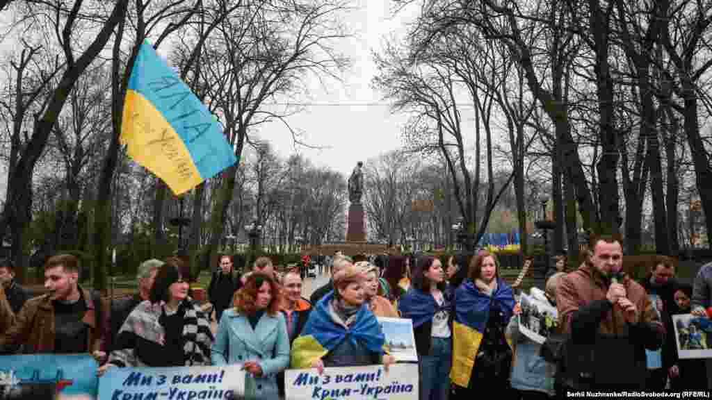 В Киеве возле памятника Тарасу Шевченко прошла акция солидарности в борьбе против аннексии Крыма. Дата выбрана неслучайно: 206 лет назад 9 марта родился украинский поэт, писатель и художник Тарас Шевченко, а в 2014 году 9 марта стало одним из главных дней борьбы против российской оккупации в Крыму.
