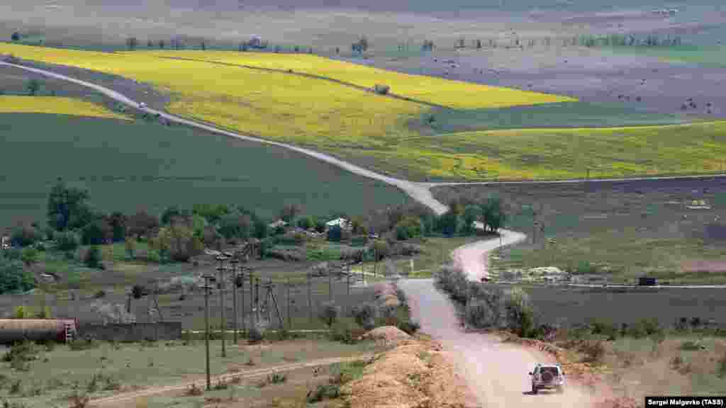 Вид на рапсовое поле близ села Новозбурьевка, что в Симферопольском районе Крыма. Традиционно их цветение начинается в мае. Это время, когда с высоты птичьего полета сельхозугодья полуострова выглядят как разноцветное лоскутное одеяло: ярко-желтые поля рапса выделяются на фоне других.