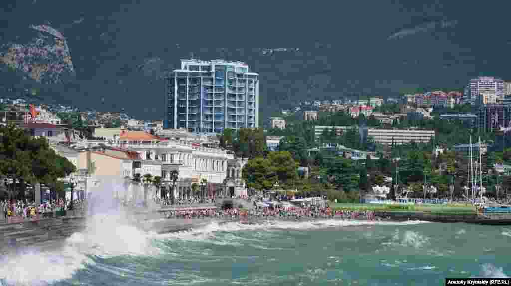 Свое 180-летие курортная столица Крыма отметила штормом в 3 балла. Пляжные планы большинству отдыхающим 11 августа пришлось отложить и довольствоваться, в основном, променадом по обильно поливаемой брызгами моря набережной.