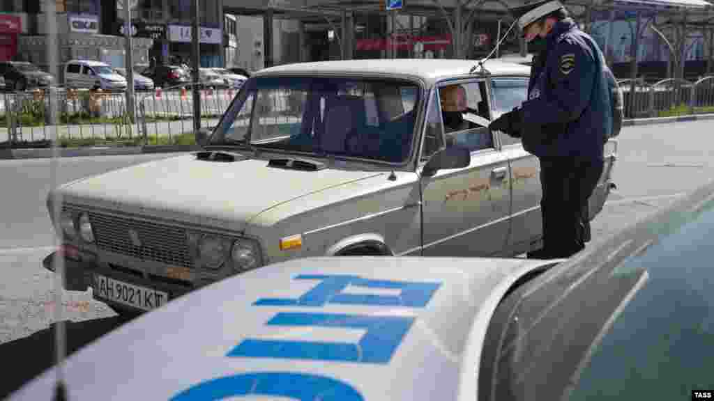 Сотрудник российской ДПС проверяет документы у водителя автомобиля на площади Советской в Симферополе.