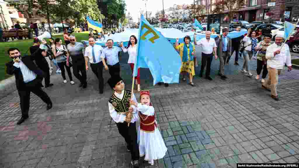 В Киеве прошли торжественным маршем по Крещатику в честь Дня крымскотатарского флага. 40-метровый голубой флаг с желтой тамгой развернули на перекрестке двух центральных улиц города и пронесли до Майдана Независимости. В шествие приняли участие глава Меджлиса крымскотатарского народа, народный депутат Рефат Чубаров, крымскотатарский активисты и простые киевляне.