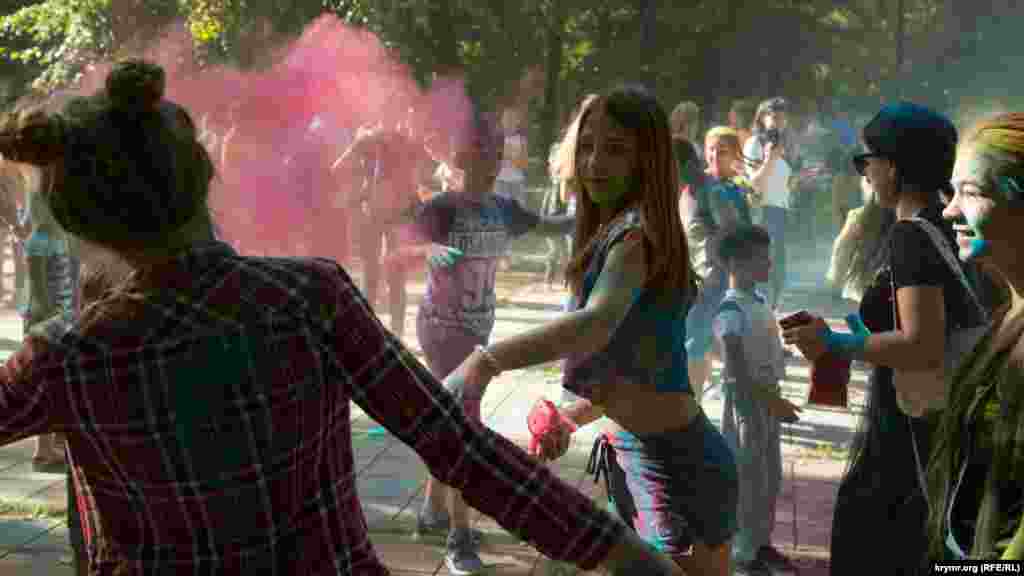 В Симферополе в Гагаринском парке прошел фестиваль красок Холи. Это индийский праздник, на котором участники обсыпают друг друга красками из трав и натуральных красителей. В симферопольской битве красками участвовало около 100 человек.