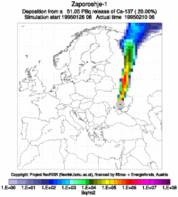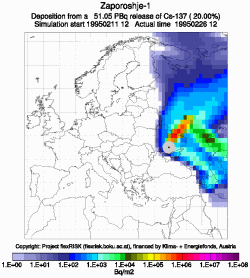 При любом повреждении такого устройства – вот представьте себе термос, а внутри радиация и 300 градусов Цельсия, любое повреждение первого контура реактора приводит к тому, что это давление выплевывает в атмосферу, по расчетам, примерно четверть накопленного. И мы можем посмотреть, есть оценки, сделанные институтом BOKU в Вене, которые были сделаны отнюдь не для военных каких-то ситуаций. Просто австрийцы обсчитывали, какие могут быть сценарии катастроф, в том числе – для реактора ВВР 1000. Это атмосферная модель, поэтому они сделали один раз расчет для реактора, потом его адаптировали к погоде, к возможным условиям той или иной местности.