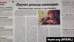 «Крымская правда» в статье «Получите денежную компенсацию» сообщает о деятельности мошенников, которые обманывают крымчан, выдавая себя за сотрудников подконтрольного Москве Министерства финансов Крыма. По словам российского министра финансов Крыма Ирины Кивико, ведомство фиксирует массовую рассылку на мобильные телефоны сообщений, содержащих вредоносные вложения. Такие СМС помогают получать доступ к банковским счетам крымчан. Неустановленные лица отправляют сообщение на телефон, где уведомляют, что Единым центром возвратов неиспользованных накоплений проведена поверка документов конкретного человека на госвыплаты, а в результате проверочных мероприятий произведен перерасчет. По итогам перерасчета гражданину якобы начислена денежная компенсация на внушительную сумму. Для того чтобы получить несуществующую выплату, необходимо незамедлительно перечислить мошенникам определенную сумму на счета подставных «доверенных» лиц якобы в качестве «госпошлины» или других «обязательных» платежей. В случае отказа оказывается моральное давление на граждан. Поступают сообщения, что причитающиеся им средства будут отправлены в бюджет государства, а дело передано в архив и не будет подлежать возврату. В крымском Минфине свою причастность к указанной рассылке отрицают, советуют черпать информацию на официальном сайте ведомства, а также в СМИ.